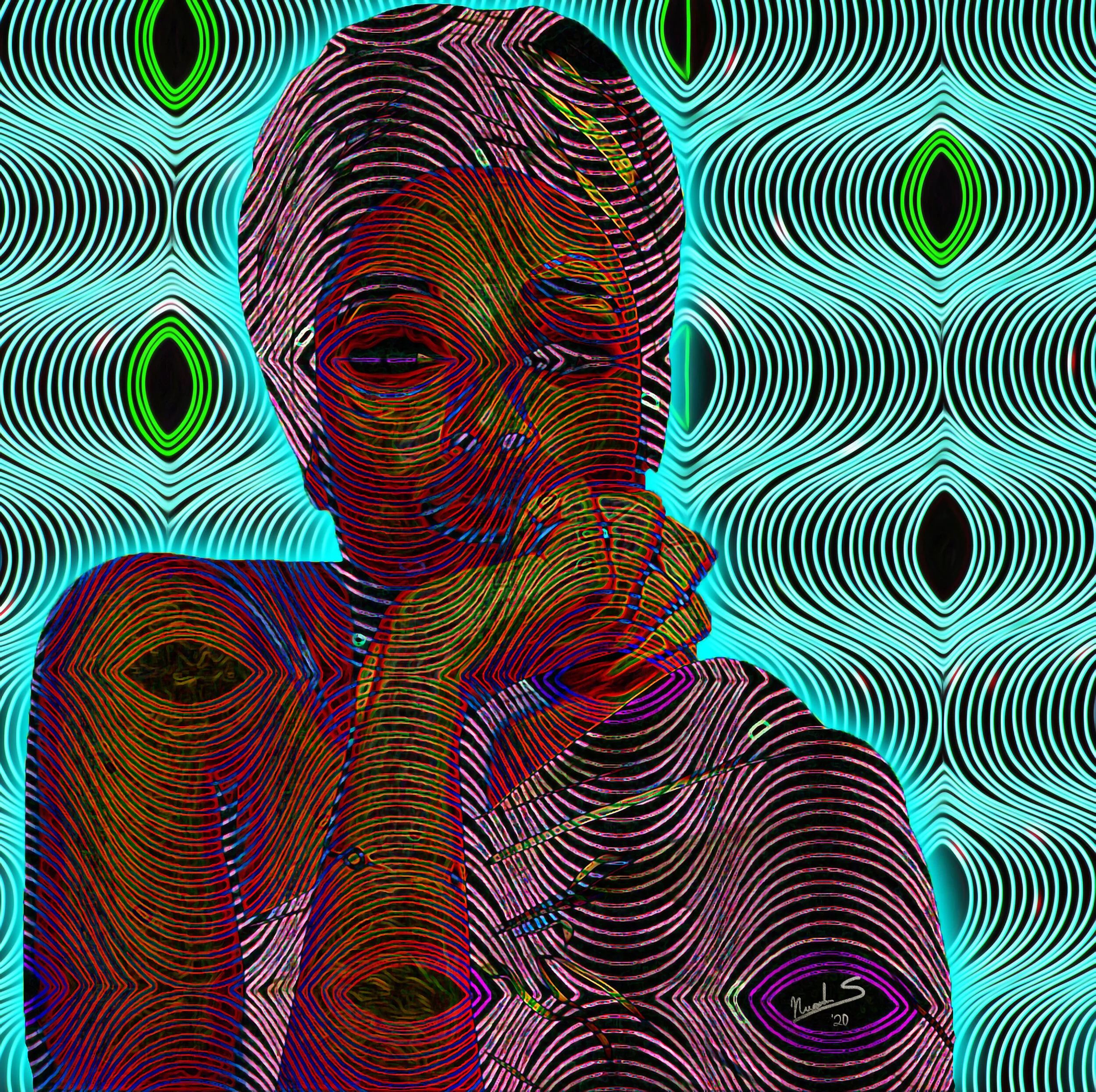 The future is digital. MYSELVES presents a story of the future and the past: my future and my past. I express the desire to hide and be seen, simultaneously, and the hesitations to treasure true beauty and strength while exploring the sui generis nature of individuality. I am my own muse. My thoughts and truths inspire me and express the universal struggle of identity and mental soundness – a merging of inner worlds with the textures of reality. My works show my facial features interwoven with patterns that reflect my powerful heritage and African culture representing a significant slice of my being.